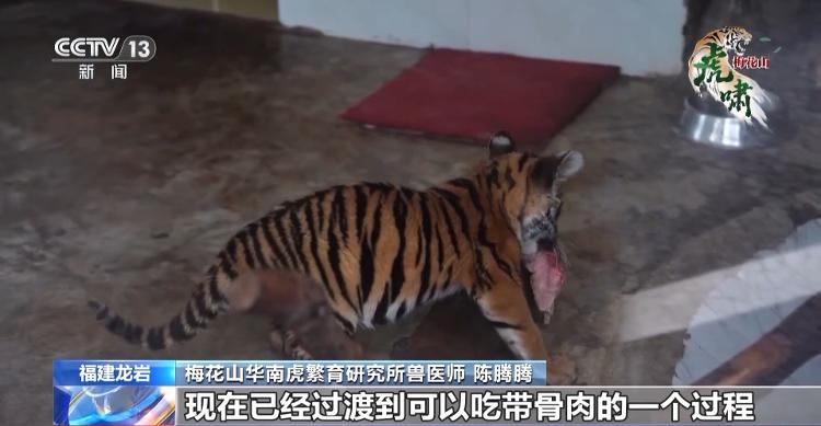 梅花山华南虎繁育研究所兽医师 陈腾腾:阿珍目前已经从肉丁、肉块、肉条过渡到可以吃带骨肉的过程,接下来的日子,我们慢慢地把它的饮食转变为像成年虎一样的日常采食时间。