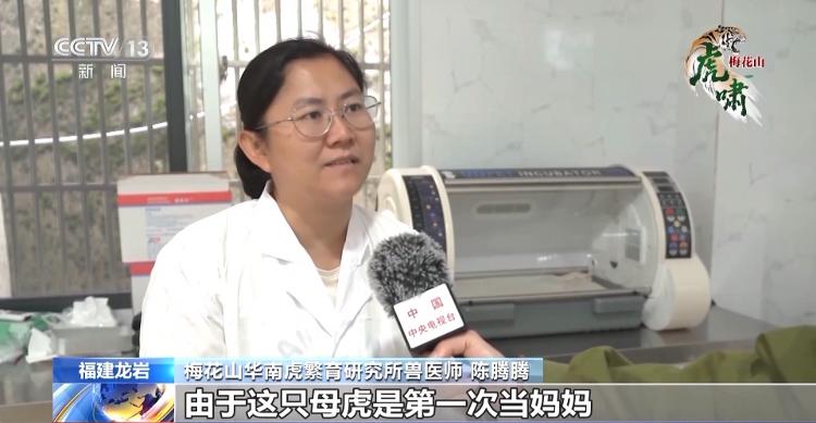 梅花山华南虎繁育研究所兽医师 陈腾腾:由于这只母虎是第一次当妈妈,在生产后期,胎儿头露出来又缩回去,整个生产过程还是比较艰难的。