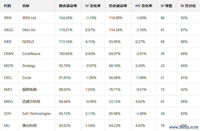 美股引申波动幅度排行榜前十(标的市值>100亿美元,且期权成交量>10万张)