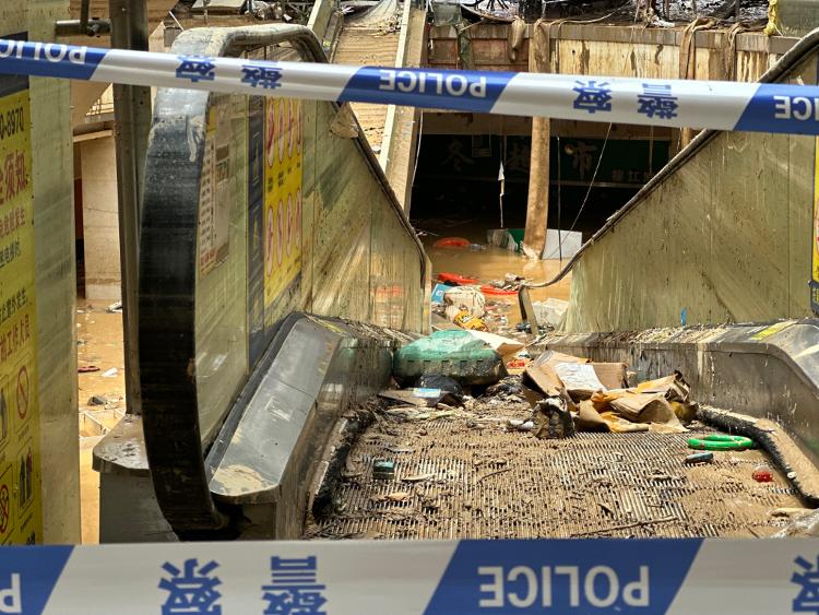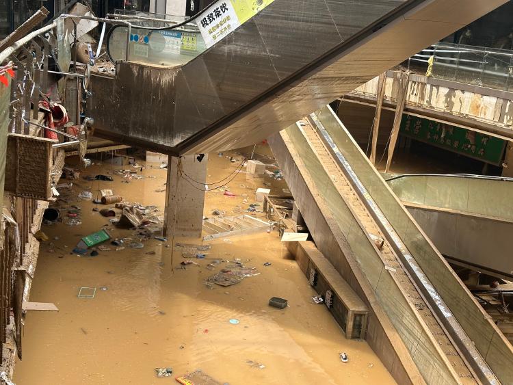 澎湃新闻注意到,洪水倒灌进入常驰财富广场负一楼后形成较深积水,一楼商铺均被水淹。目前,现场一片狼藉,地上堆积着厚厚一层泥浆,部分商铺正在清理受损物资。一名商户告诉澎湃新闻,她在此地有三个铺面,没有预料到损失如此惨重。