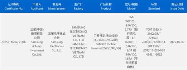 认证信息显示,该机搭配EP-TA800电源适配器,最高支持25W充电,支持卫星通信。