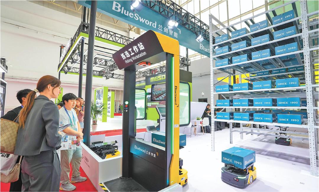 新华社发 7月16日,参观者在先进制造链展区兰剑智能展台了解“蜘蛛侠悬挂式料箱机器人系统”。