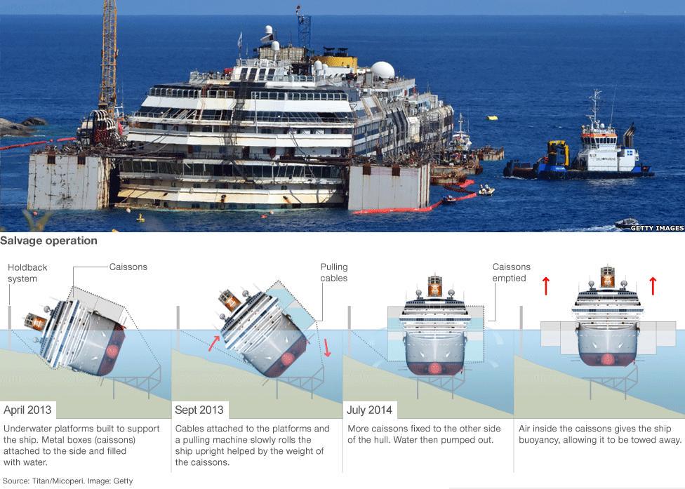 整个救援工作分步骤展开,第一步是先移除了船体内剩余的2400吨燃油,一方面是减轻重量,一方面是防止海洋污染。第二步则是建造平台。救援人员在船体下方的海床上,利用混凝土和钢材构筑了坚实的基座,以对船体形成支撑。一方面防止其继续下沉,另一方面保障其扶正后能有一个稳定的支撑。第三步,就是在船体的侧方安装浮筒。救援人员在其露出水面的船体部分,焊接了15个大型的钢制浮筒,每一个的排水量就高达百吨以上。然后注水,使得船体渐渐恢复平衡。第四步就是使用钢栏和绞盘系统,一头固定在船只上,另一头固定在岸上的绞盘上,组成一个拉力系统,光是钢缆的程度就超过了6公里,最后才慢慢将这艘超大的船只扶着。