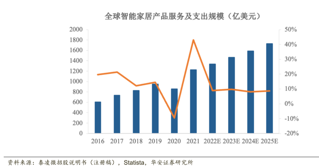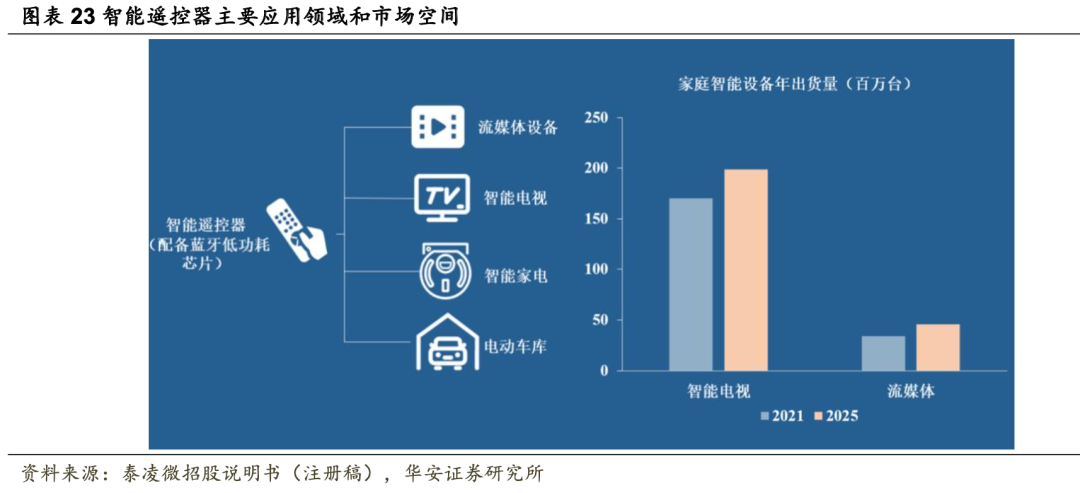 根据Omdia和Kagan机构的统计,2021年全球智能电视出货量约为1.70亿台,预计2025年出货量将增长至1.99亿台;2021年流媒体播放器出货量约为0.34亿台,预计2025年出货量将增长至0.46亿台。智能遥控器作为此类硬件的重要配套设备,市场需求将同步增强。在“万物互联”趋势下,不仅限于智能电视、流媒体等大型家庭硬件,越来越多的硬件例如智能恒温、智能照明等应用将纳入家庭物联网生态中,应用场景将延伸到家庭的更多角落。