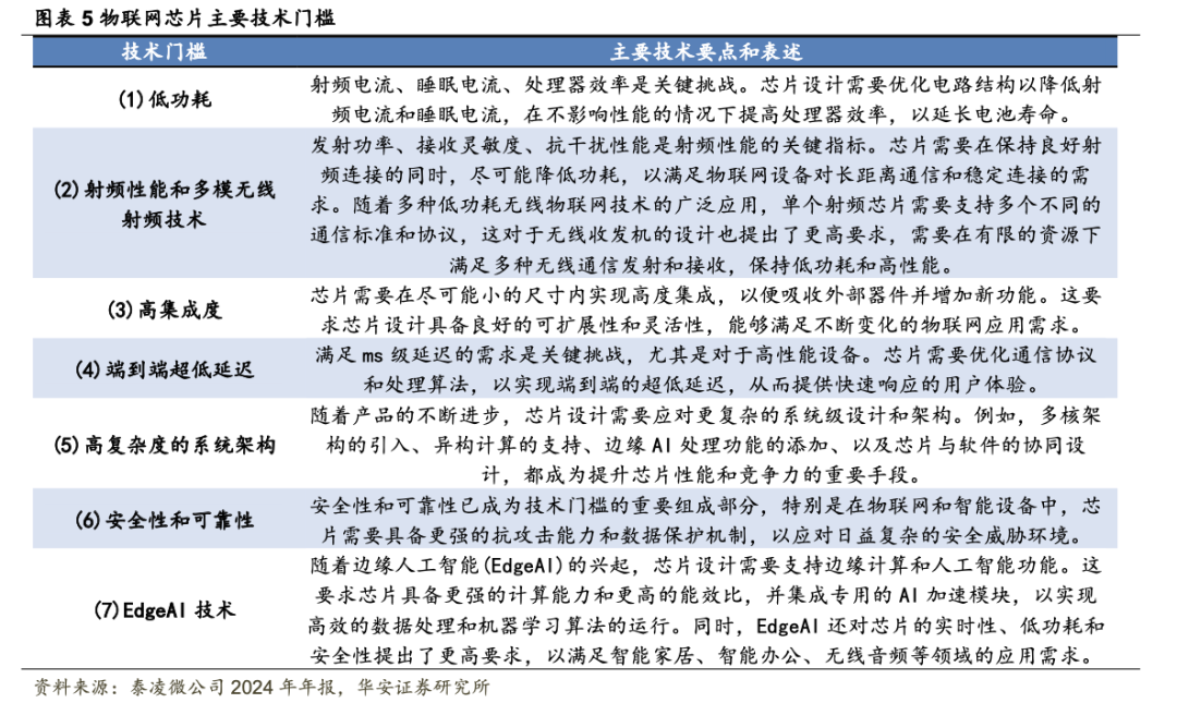 公司技术实力与日俱增,持续投入研发巩固技术壁垒。物联网连接芯片有七大技术门槛。低功耗领域,射频电流、睡眠电流、处理器效率是关键挑战。芯片设计需要优化电路结构以降低射频电流和睡眠电流,在不影响性能的情况下提高处理器效率,以延长电池寿命;高集成度方面,芯片需要在尽可能小的尺寸内实现高度集成,以便吸收外部器件并增加新功能。这要求芯片设计具备良好的可扩展性和灵活性,能够满足不断变化的物联网应用需求;端到端超低延迟方面,满足ms级延迟的需求是关键挑战,尤其是对于高性能设备。芯片需要优化通信协议和处理算法,以实现端到端的超低延迟,从而提供快速响应的用户体验;高复杂度的系统架构方面,随着产品的不断进步,芯片设计需要应对更复杂的系统级设计和架构。例如,多核架构的引入、异构计算的支持、边缘AI处理功能的添加、以及芯片与软件的协同设计,都成为提升芯片性能和竞争力的重要手段;EdgeAI技术方面,随着边缘人工智能(EdgeAI)的兴起,芯片设计需要支持边缘计算和人工智能功能。这要求芯片具备更强的计算能力和更高的能效比,并集成专用的AI加速模块,以实现高效的数据处理和机器学习算法的运行。同时,EdgeAI还对芯片的实时性、低功耗和安全性提出了更高要求,以满足智能家居、智能办公、无线音频等领域的应用需求。