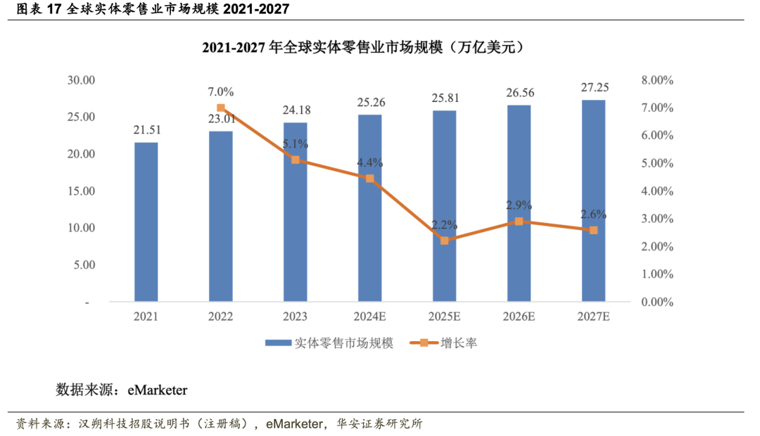 从线下零售市场规模来看,2020年以来,全球消费者的线上购买倾向渐趋稳定,而实体店消费的倾向则迎来复苏。结合eMarketer数据进行测算,2022年度、2023年度全球线下零售规模分别同比增长7.0%、5.1%,随着经济生活常态化,未来增幅将逐步恢复平稳,预计2023-2027年间复合增长率约3%。