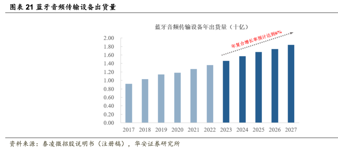 根据国际蓝牙技术联盟统计,全球蓝牙音频传输设备出货量目前已经从2017年的9.2亿个持续增长至2022年的13.6亿个。2027年蓝牙音频传输设备年出货量相比2022年预计将增长35.29%,年复合增长率逾6%。凭借蓝牙音频的下游应用,如TWS(True Wireless Stereo,即真无线立体声)耳机、智能蓝牙音箱、蓝牙助听设备等市场的不断扩张,尤其是TWS耳机爆发式的需求增长,蓝牙音频芯片的市场需求也不断上涨。