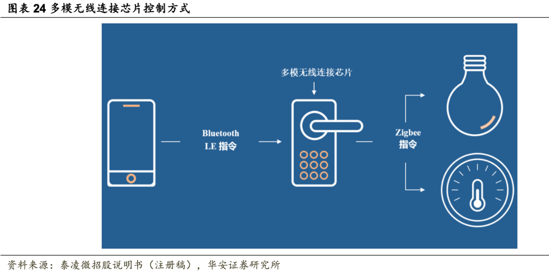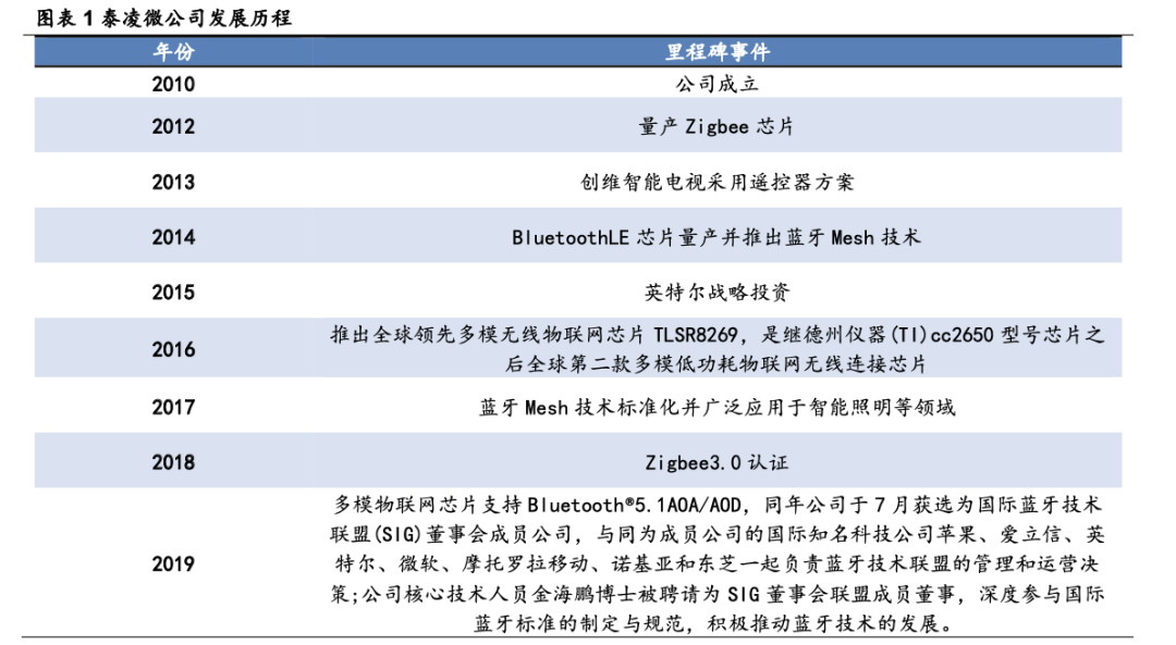 第一阶段:2010-2016年。公司成立于2010年,2012年公司实现Zigbee芯片的量产,2013年公司芯片进入创维智能电视采用遥控器方案,2014年公司BluetoothLE芯片量产并推出蓝牙Mesh技术;2015年公司获得英特尔战略投资;2016年公司推出全球领先多模无线物联网芯片TLSR8269。该芯片是继德州仪器(TI)cc2650型号芯片之后全球第二款多模低功耗物联网无线连接芯片。相较cc2650的支持协议范围ZigBee协议和低功耗蓝牙协议,公司TLSR8269芯片可支持包括低功耗蓝牙协议、低功耗蓝牙Mesh组网协议、ZigBee协议、苹果Homekit协议和Thread协议等在内的所有重要低功耗物联网协议。
