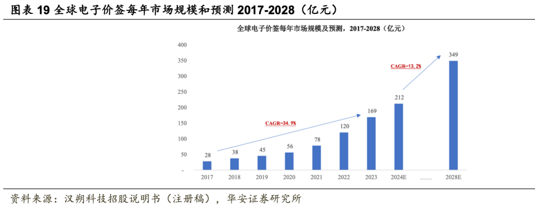 随着人工成本的持续上升,门店数字化的诉求日益提升及实践推广越来越广泛,电子价签作为降低零售门店运营成本的重要工具,渗透率将日益提升。根据法国巴黎银行的预测,2024年全球将有超过2,000个零售商的逾100万家实体门店配置电子价签;根据CINNO统计数据,2017年-2023年全球电子价签市场规模从28亿元上升至169亿元,复合增长率为34.9%,2028年全球电子价签的市场规模将达到349亿元,2024年至2028年复合增长率为13.2%。