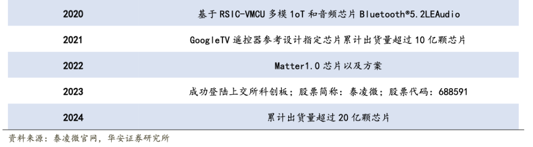 公司成立于2010年,2016年公司推出全球领先多模无线物联网芯片TLSR8269。该芯片是继德州仪器(TI)cc2650型号芯片之后全球第二款多模低功耗物联网无线连接芯片。2019年7月,公司获选为国际蓝牙技术联盟(SIG)董事会成员公司,与同为成员公司的国际知名科技公司苹果、爱立信、英特尔、微软、摩托罗拉移动、诺基亚和东芝一起负责蓝牙技术联盟的管理和运营决策;公司核心技术人员金海鹏博士被聘请为SIG董事会联盟成员董事,深度参与国际蓝牙标准的制定与规范,积极推动蓝牙技术的发展。2021年GoogleTV遥控器参考设计指定芯片累计出货量超过10亿颗芯片;2022年公司研发出Matter1.0芯片以及方案;2023年公司成功登陆上交所科创板;2024年公司累计出货量超过20亿颗芯片。