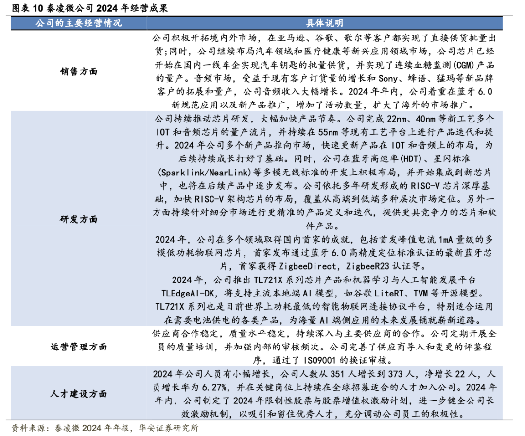 2024年公司取得多项经营成果。在销售方面,公司积极开拓境内外市场,在亚马逊、谷歌、歌尔等客户都实现了直接供货批量出货;同时,公司继续布局汽车领域和医疗健康等新兴应用领域市场,公司芯片已经开始在国内一线车企实现汽车钥匙的批量供货,并实现了连续血糖监测(CGM)产品的量产。音频市场,受益于现有客户订货量的增长和Sony、蜂语、猛玛等新品牌客户的拓展和量产,公司音频收入大幅增长。