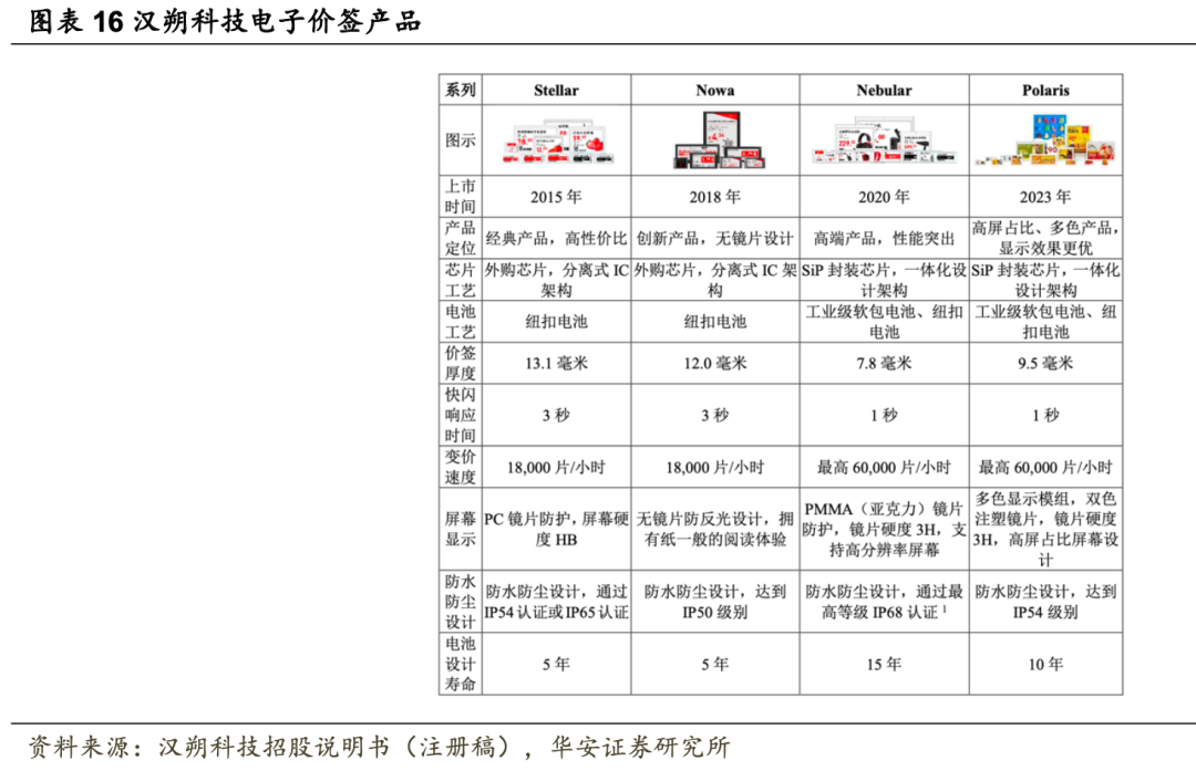 公司主要核心客户在电子价签领域以汉朔科技为主。电子纸显示价签以3色为主,适用于商品价格、产品参数、库存信息、简易图片等数据显示量较少的应用场景。公司始终保持产品的持续快速创新,已先后推出Stellar、Nowa、Nebular和Polaris四个系列、合计数十种类型的电子纸显示价签。