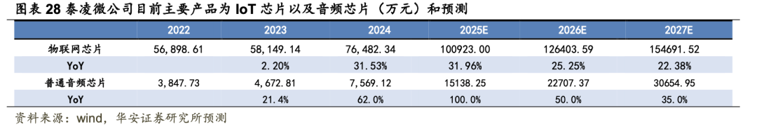 预计2025-2027年公司营业收入为11.61亿元、14.91亿元、18.53亿元。同比增长37.5%、28.5%、24.3%。公司核心产品来自于物联网芯片和音频芯片。