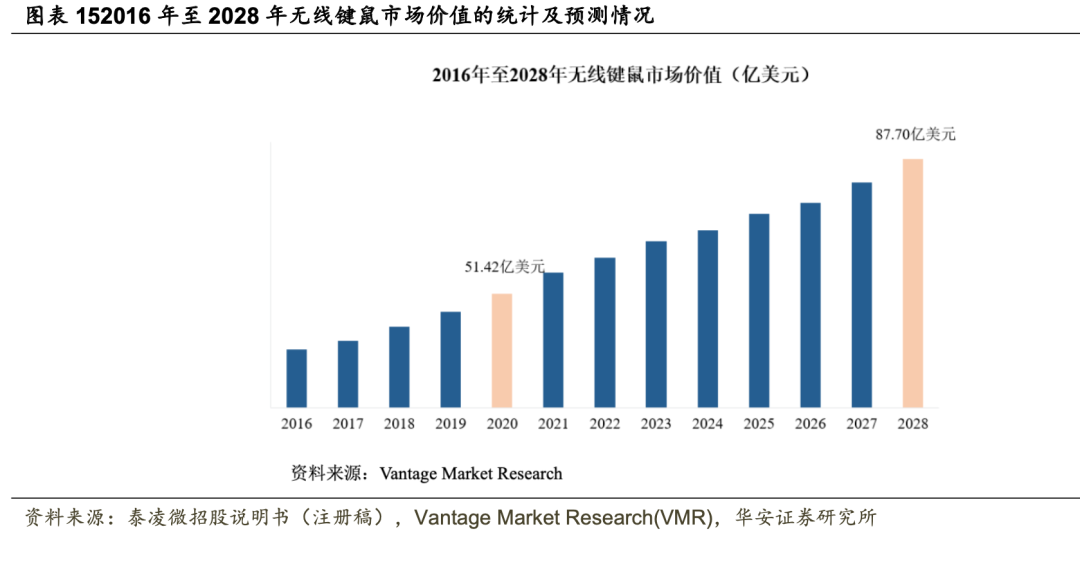 2.4GHz私有协议无线连接技术凭借其频宽和续航能力的优势在无线鼠标和键盘领域得到了相当广泛的应用,根据全球市场调研机构Vantage Market Research(VMR)统计,得益于无线连接技术、电池技术的进步及个人购买力的提高,2020年全球无线鼠标和键盘的市场价值为51.42亿美元,预计到2028年将增长到87.70亿美元,年复合增长率达将近7%。