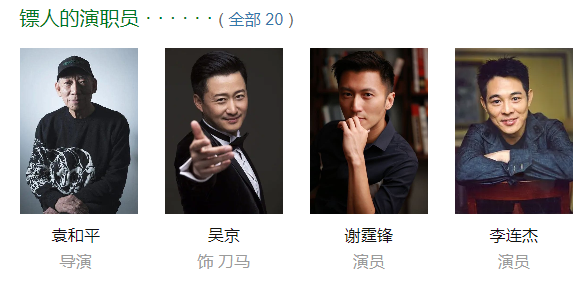 还有,之前有人说在淘票票和猫眼平台上,《镖人》已经将那某那茜除名了。可细看过之后我们会发现,在这些平台上,《镖人》的演员表就只剩下吴京、谢霆锋和李连杰三个人了,张晋、王宝强以及等也都不在其中。